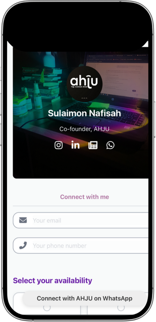 With AHJU, you can share your contact, work, portfolio, website, and even sell from Instagram, LinkedIn, WhatsApp, Twitter, and more — all with just one card.